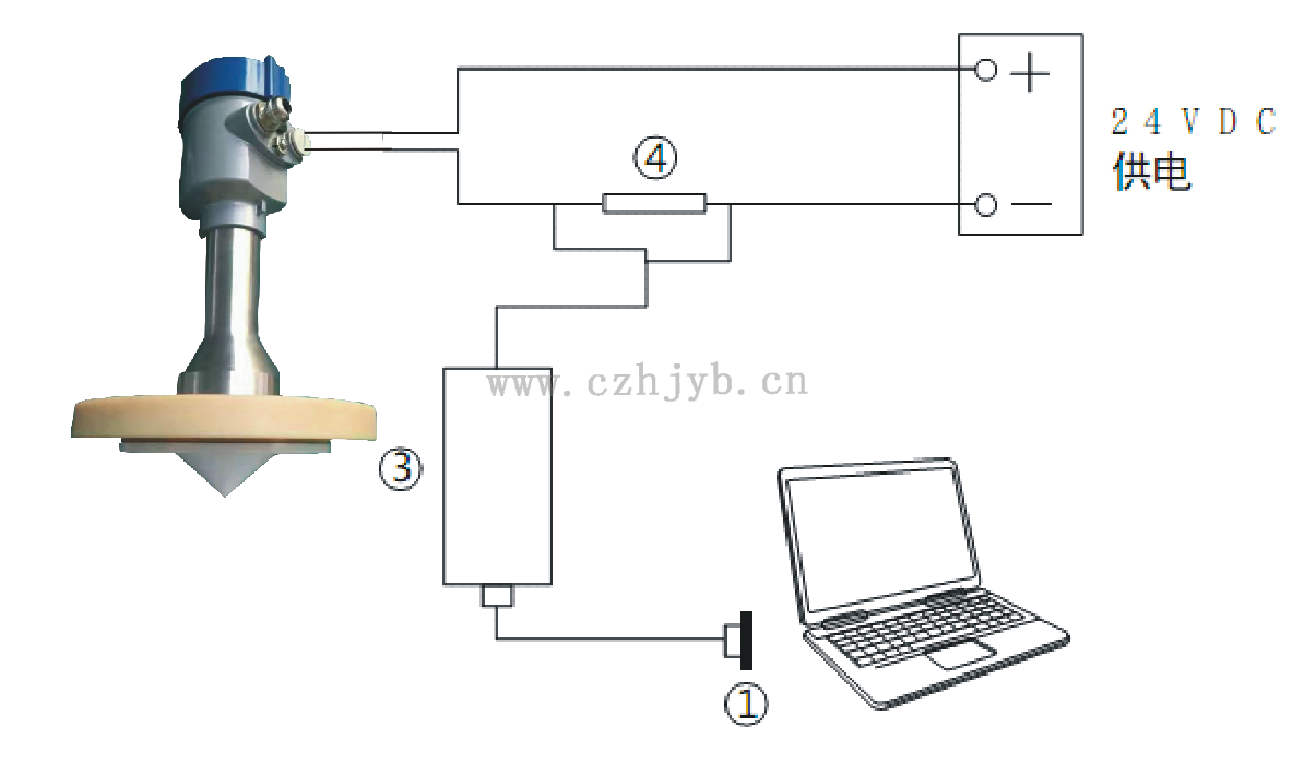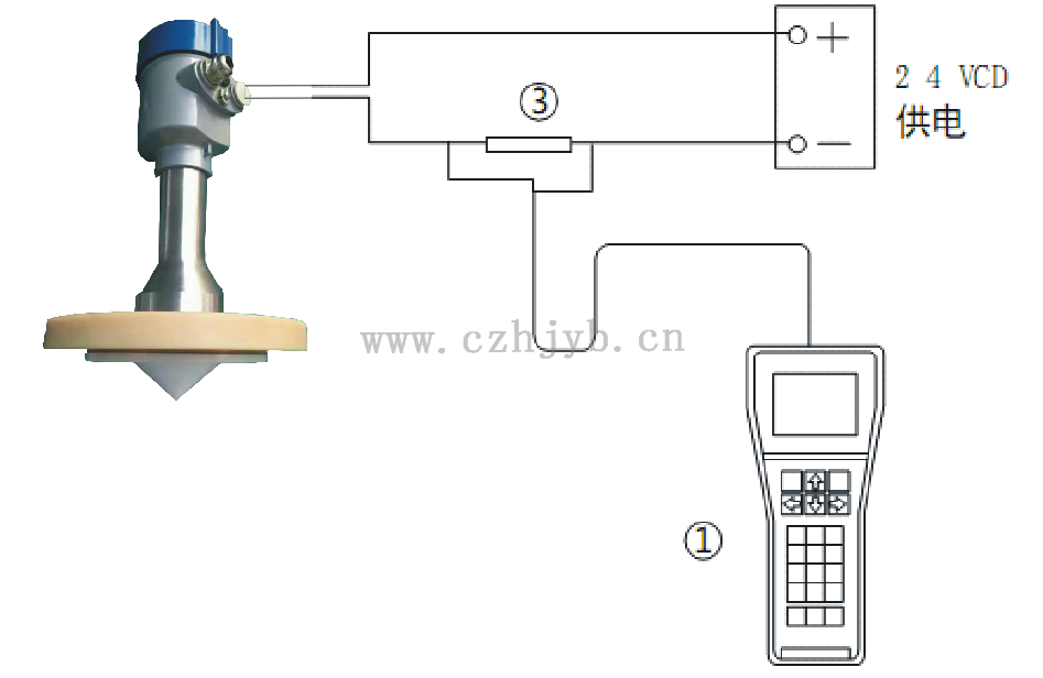 (4~20) mA/HART(兩線制)      供電電源和輸出電流信號共用一根兩芯屏蔽電纜線。具體供電電壓范圍參見技術數據。對于本安型須在供電電源與儀表之間加一個安全柵。